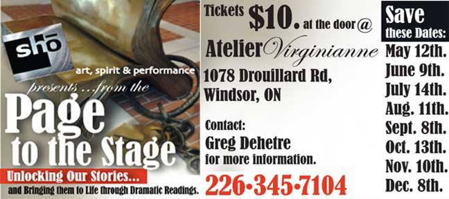 I’m thrilled to announce that my piece ‘Momisfesto’ will be performed at ‘From the Page to the Stage’ event on Tuesday, November 10th, 2015 at 8pm at the Atelier Virginianne (1078 Drouillard Rd. Windsor). This will be the second piece that I’ve had be a part of this incredibly creative and artistic storytelling event. Tickets are only $10.00! I hope to see you there!