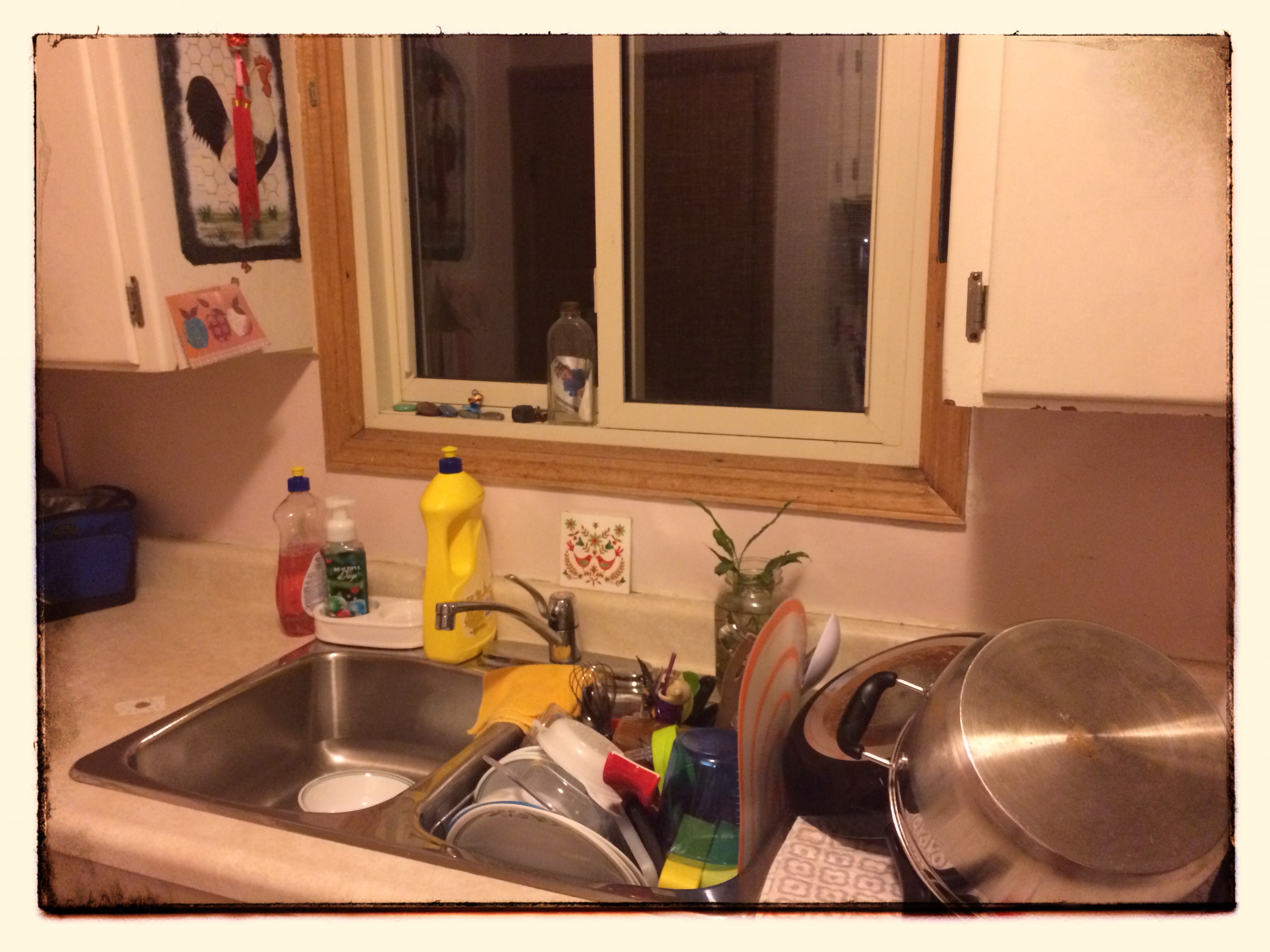 This is where I wash the dishes. The window looks into the muddy back yard. There is barely room to stack the dirty dishes to the left what with the school lunch pails, the knife block, and the paper towel stand taking space. To the right, pots and pans always clutter the counter, butting up against the coffee maker. It’s all fine. Our house is cluttered. That’s the way it will be. That’s the way we like it. (We really do. I asked the kids if they mind that there’s jazz everywhere – on every wall, on every table surface. They told me they love it.)