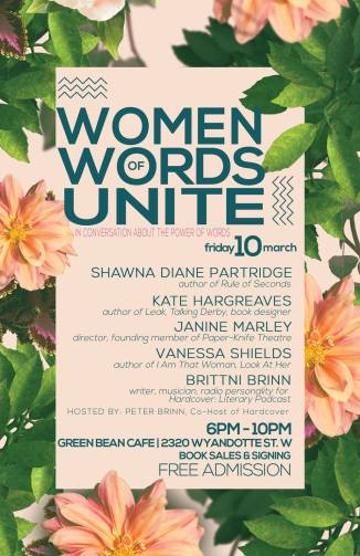 Hot off International Women’s Day, I’m psyched to be sharing the stage with fellow women of words Kate Hargreaves, Shawna Partridge, Janine Marley and Brittni Brinn for a panel discussion tomorrow night at the Green Bean Cafe in Windsor. The panel starts at 6pm! It will be a wonderful, inspiring and helpful conversation. Please join us! It’s free! But bring money for delicious coffee/treats, and of course, books!!