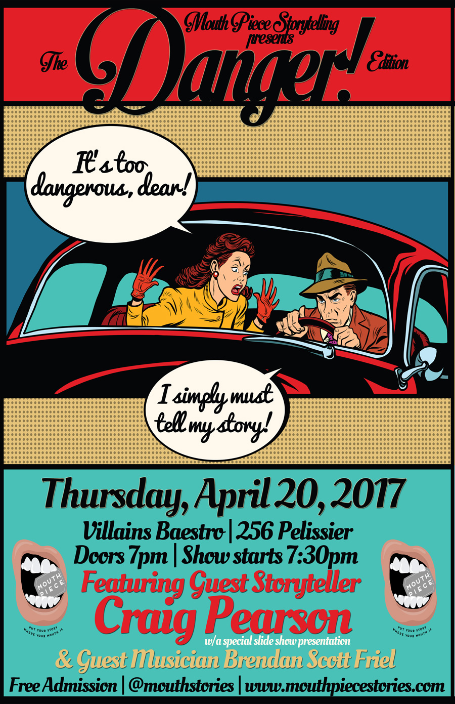The next edition of Mouth Piece Storytelling is DANGER! Oh yes, it’ll be a wild night, I’m sure! Starting off with a dangerous presentation by journalist Craig Pearson! Featuring musician Brendan Scott Friel – I promise the night will be fabulously wonderfully danger-ful!
