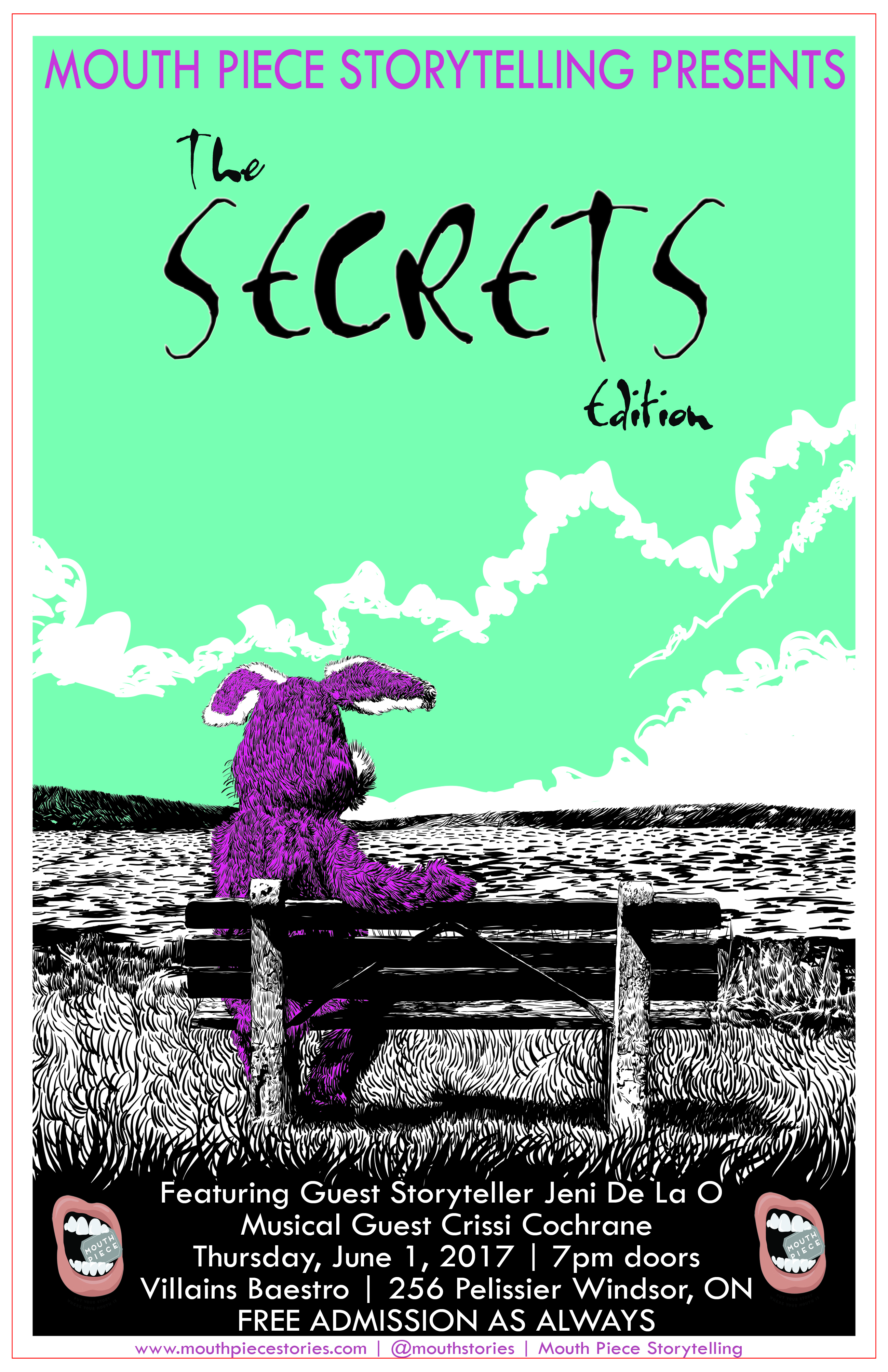 Thursday, June 1, 2017 – Mouth Piece Storytelling – The Secrets Edition – Everyone has secrets – are you willing to share yours? I hope so! Join Guest Storyteller Jennifer De La O and Musical Guest Crissi Cochrane as we burst open those secrets and throw them into the world! Same place: Villains Baestro. Same time: Doors 7pm. Show start: 7:30pm! Free for all! Let us know you’re comin’: Facebook event page