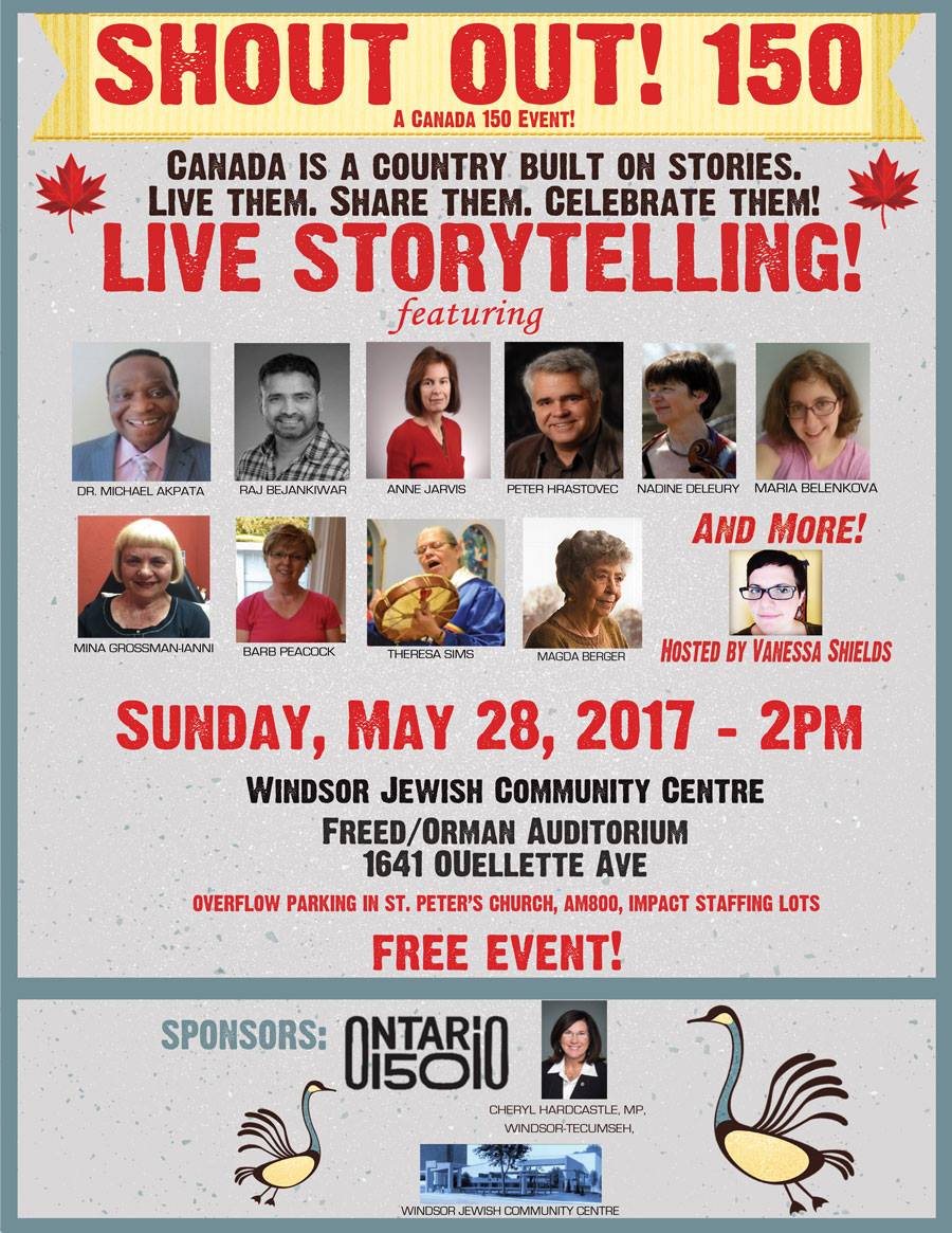 Sunday, May 28, 2017 – I’ll be hosting the Jewish Community Centre of Windsor’s Canada 150 Event – Shout Out! 150! We welcome eleven diverse storytellers from our community who will share stories about their experience as Canadians. This is a free event and will be followed by a dessert reception! Oh, it’s also my birthday! So, eat cake for me! Let us know you’re comin’: Facebook event page