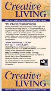 Part of a 6-week Creative Living workshop hosted by Ruth Ann Wilhelm. The workshop begins October 11! Contact Ruth for more info or to sign up! 519-919-7874.