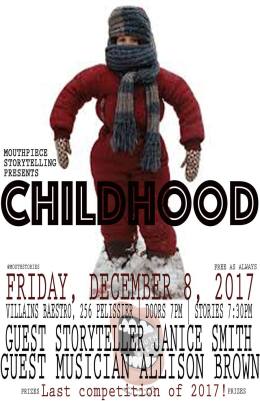 On FRIDAY, DECEMBER 8TH, 2017 AT 7:30PM AT VILLAINS BAESTRO in downtown Windsor, I’m hosting the final storytelling competition of the season: Mouth Piece Storytelling – The Childhood Edition! Featuring Guest Storyteller Janice Smith and Guest Musician Allison Brown! This is our last event of 2017 – and it’s on a FRIDAY! – so gather your childhood stories and come on out and share! The winner will get a fancy prize and advance to our Master Mouth-Off event in the new year.