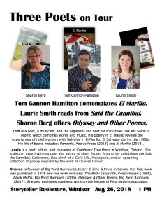 Join local poet Laurie Smith, Sarnia poet-on-tour Sharon Berg and Toronto poet and musician Tom Gannon Hamilton as they read poetry from their latest books.