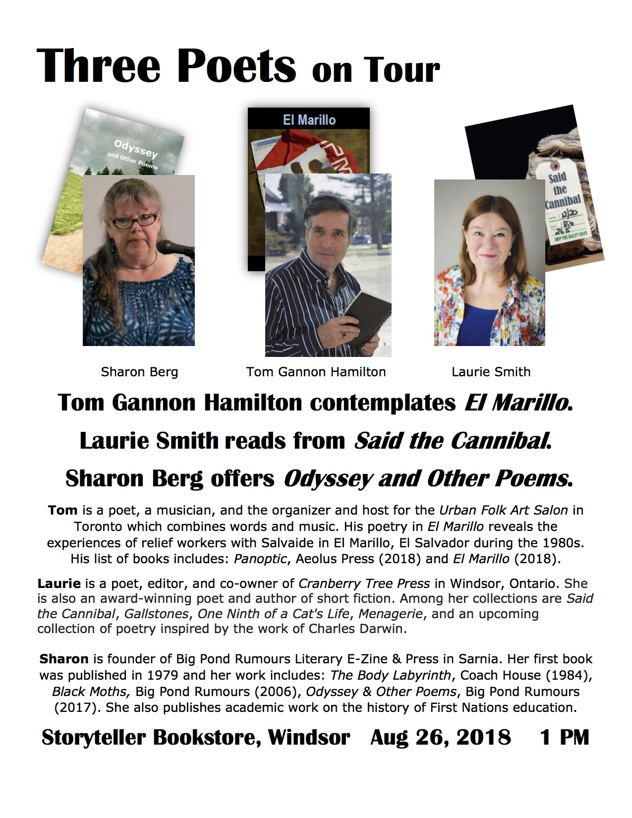 Join local poet Laurie Smith, Sarnia poet-on-tour Sharon Berg and Toronto poet and musician Tom Gannon Hamilton as they read poetry from their latest books.