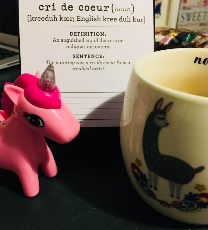 cri de coeur (noun): an anguished cry of distress or indignation, outcry.