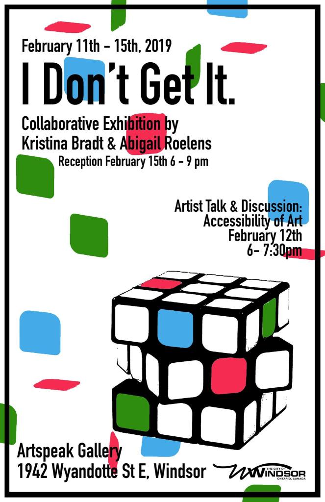 Closing reception for ‘I Don’t Get It’ poetry and art exhibition at Artspeak Gallery in Walkerville. Featuring Kristina Bradt & Abigain Roelens. 6pm – 9pm. Free!