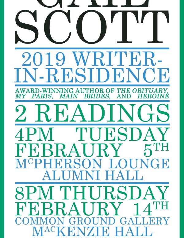 Writer-in-Residence Gail Scott is giving a reading at the Common Ground Gallery at Mackenzie Hall. (Sorry the top of her name was cut off!) – 8pm