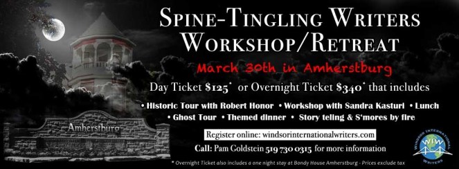 Spine-Tingling Writers Retreat – Join the Windsor International Writers and Amherstburg’s Bondy House for a spine-tingling Writers Workshop/Retreat on Saturday, March 30th, 2019. The retreat includes the following four great features: