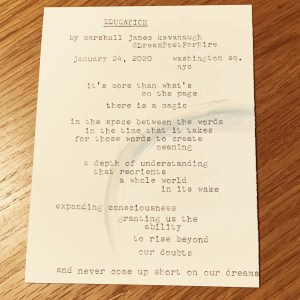 While my family and I were in New York City in January, we visited Washington Square Park. It’s a hot-spot for creatives, often the gathering place for buskers, musicians, wild fashion, weddings and serious games of chess. On this particular day, we had the pleasure of meeting poet Marshall James Kavanaugh aka ‘@DreamPoetForHire‘. Marshall is a traveling poet who writes poetry for people via his trusty typewriter. All he asks is that the person gives him a theme to write about. On the day we met, our family had just finished a tour at NYU so education was on our minds. I asked Marshall to write us a poem about education/learning.