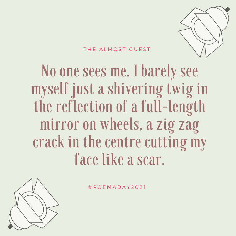 I dream I’m the guest on The Tonight Show starring Jimmy Fallon. A tall twenty-something with a headset & desperate eyes rushes me to a messy backstage then commotion & denial. Sorry, you’ve been bumped, from a different twenty-something – this one holding a clipboard & a cell phone. She doesn’t let me see her eyes. I shrink into a shadow. Witness an entourage & a famous actor saunter into old set dec & thick dirty ropes. A chair appears out of nowhere so the male star can wait in comfort. He sits with his crotch wide open like a thirsty mouth. I grip a cold light stand so I don’t fall down. No one sees me. I barely see myself just a shivering twig in the reflection of a full-length mirror on wheels, a zig zag crack in the centre cutting my face like a scar. An uproar of laughter makes dust leap in the air around me. I watch it dazzle in the beam of a spotlight.