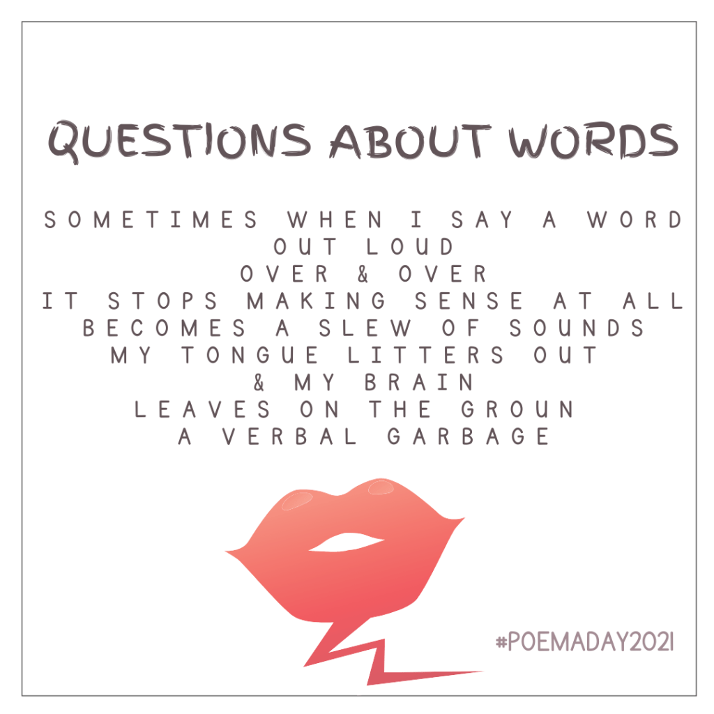 > Vanessa Shields posted: ” Questions about words Sometimes when I say a > word out loudover & overit stops making sense at allbecomes a slew of > soundsmy tongue litters out & my brainleaves on the ground a verbal garbage > Is there a word for this?When a word stops being ” >