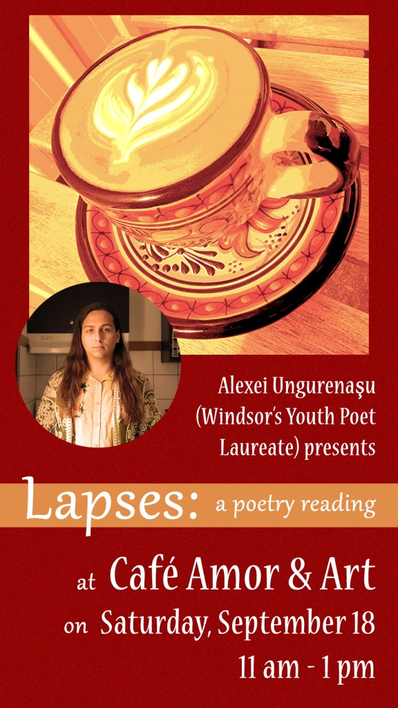 Discover the unique voice and beautiful melody of Windsor’s Youth Poet Laureate Alexei Ungurenasu this Saturday from 11am-1pm at Cafe Amor & Art (1557 Ottawa St, Windsor, ON N8X 2G3).