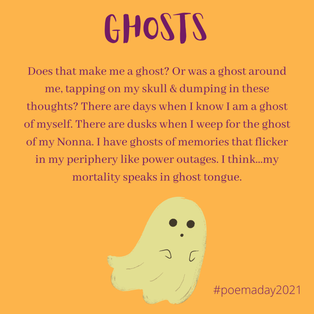 Does that make me a ghost? Or was a ghost around me, tapping on my skull & dumping in these thoughts? There are days when I know I am a ghost of myself. There are dusks when I weep for the ghost of my Nonna. I have ghosts of memories that flicker in my periphery like power outages. I think…my mortality speaks in ghost tongue.