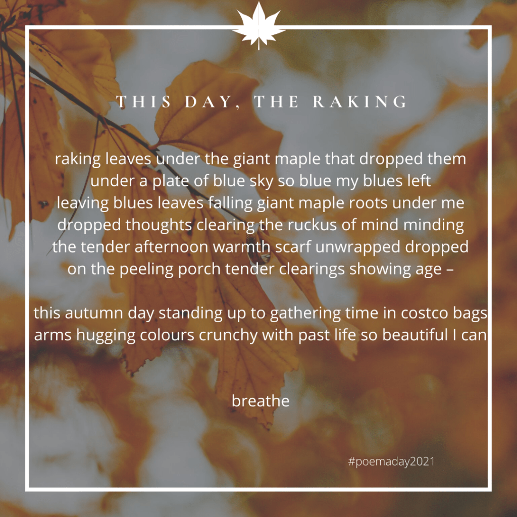 > Vanessa Shields posted: ” This day, the raking raking leaves under the > giant maple that dropped themunder a plate of blue sky so blue my blues > leftleaving blues leaves falling giant maple roots under medropped thoughts > clearing the ruckus of mind mindingthe tender afternoon wa” >