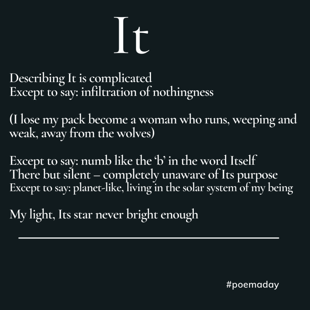 > Vanessa Shields posted: ” It When It arrivesIt’s too late for me to stop > ItIt penetrates my organs(It adores my skin wreaks havoc on my heart > continuously hunts for my soul)Its power crushes mine Describing It is > complicatedExcept to say: infiltration of nothingness (I l” >