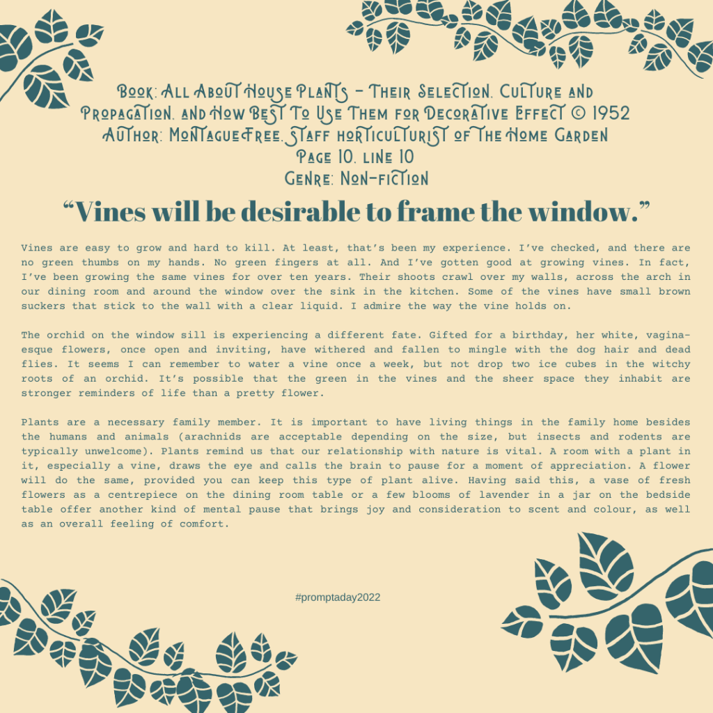 Vines are easy to grow and hard to kill. At least, that’s been my experience. I’ve checked, and there are no green thumbs on my hands. No green fingers at all. And I’ve gotten good at growing vines. In fact, I’ve been growing the same vines for over ten years. Their shoots crawl over my walls, across the arch in our dining room and around the window over the sink in the kitchen. Some of the vines have small brown suckers that stick to the wall with a clear liquid. I admire the way the vine holds on.