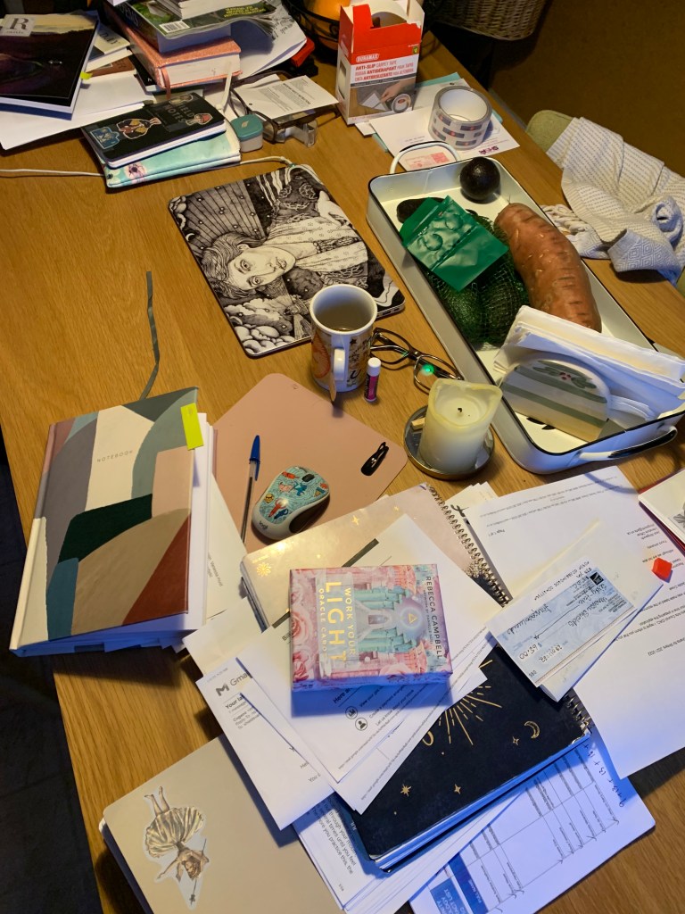 Each day my desk looks like this. Each night, I clean it up. I have piles and notebooks and file folders and pencil cases. There is always the great explosion of things to do and the great clean-up of things completed…and lists about what to do next. This is one of the reasons why blogging every day is hard for me. I’m having a hard time fitting in even a haiku on the blog…! But I’m taking the pressure off myself. As I embrace my body changes, complete big projects/grant applications, continue to work with writers…time will open up as she does and I’ll figure out how to speak through my blog again.