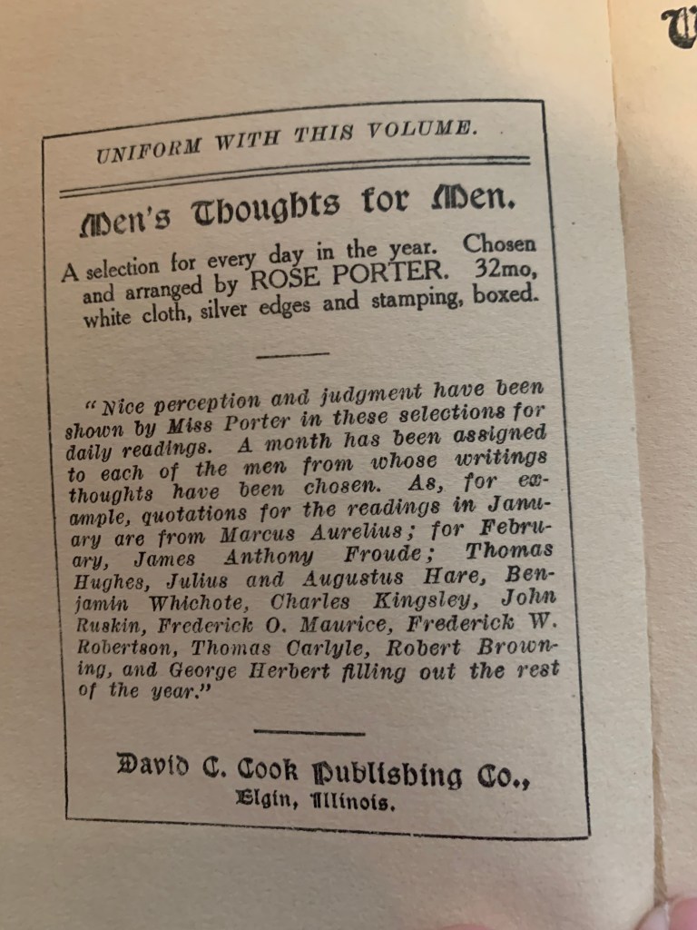First Sunday – Women’s Thoughts for Women chosen and arranged by Rose Porter, David. C. Cook Publishing Company, Elgin, Illinois, (C) 1891