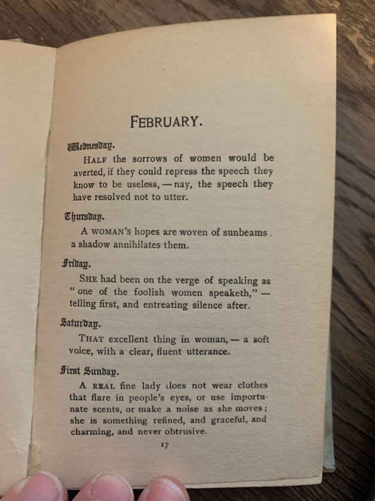 I’m both appalled and humbled by this quote…by all the words of (so-called…interesting, historical, cultural….questionable!) wisdom in the pages…Quotes from famous women, set to the different months of the year, include Elizabeth Barrett Browning, George Eliot, Charlotte Bronte, Jean Ingelow, and Christina Rossetti. And this little ditty…Look – a companion book for men! This book, also compiled by Rose Porter, is jam-packed with all male figures/writers.