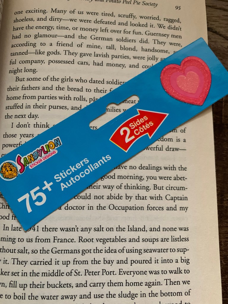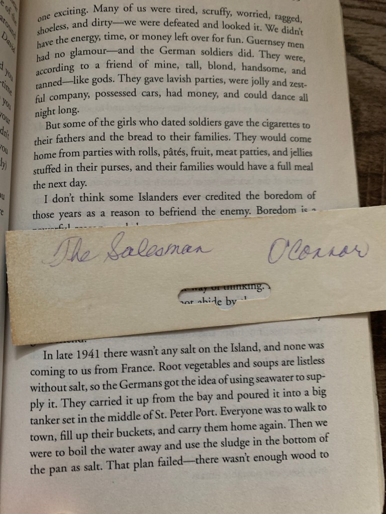 Inside a copy of The Guernsey Literary and Potato Peel Society by Annie Barrows and Mary Ann Shaffer I found an interesting book mark. The top of a sticker pack…perhaps it was a pack of heart stickers? The edges darkened with age…clearly cut with scissors…and not in a straight line. I love the reuseablity of this piece of cardboard. And what is: The Salesman…O’Connor? It is another book! The Salesman by Joseph O’Connor! Incredible…two books in one!