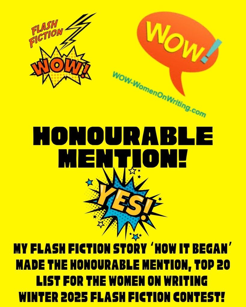 Thanks so much to the Women on Writing community, and judge for the Winter Flash Fiction contest! I made it to the top twenty (over 200 submissions!) and garnered an Honourable Mention! I’m sooo grateful and excited!