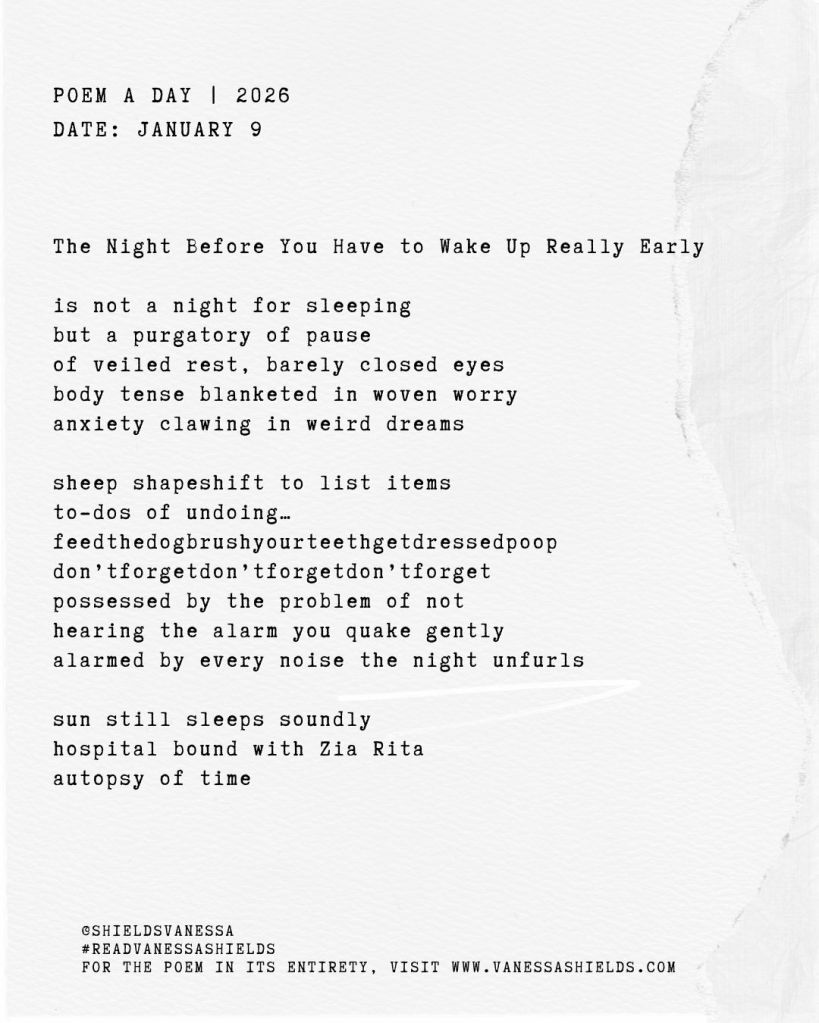 What I like about your poetry, Vanessa, what I LOVE about your poetry, is the recognition. I read what you write and I say, yeah, I feel that too. or — that’s exactly how I feel but I didn’t realize it — or, yes, that sleep-not-sleep when you know you have to get up early is just the way you describe it. And then the change with the haiku, when the night is over and you’re off doing your good deed for the day with your Zia… such a different energy than the worrisome sleep.