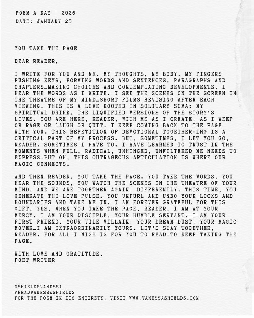 And then reader, you take the page. You take the words, you hear the sounds, you watch the scenes in the theatre of your mind. And we are together again, differently. This time, you generate the love pulse. You unfurl and undo your locks and boundaries and take me in. I am forever grateful for this gift. Yes, when you take the page, reader, I am at your mercy. I am your disciple, your humble servant. I am your first friend, your vile villain, your dream dust, your magic mover…I am extraordinarily yours. Let’s stay together, reader. For all I wish is for you to read…to keep taking the page.