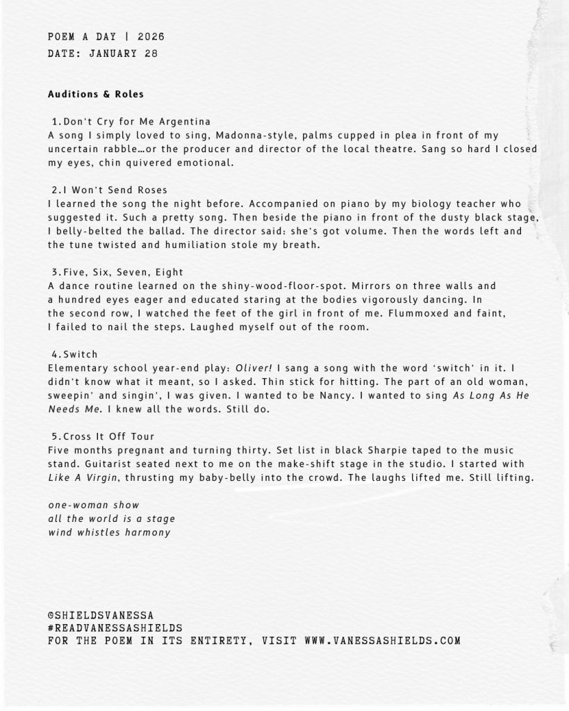 I learned the song the night before. Accompanied on piano by my biology teacher who suggested it. Such a pretty song. Then beside the piano in front of the dusty black stage, I belly-belted the ballad. The director said: she’s got volume. Then the words left and the tune twisted and humiliation stole my breath.