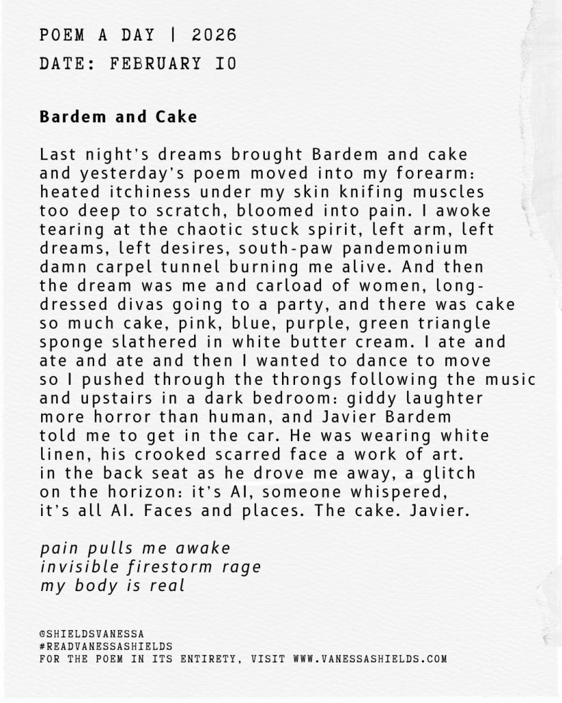 Before I fell asleep last night, we were watching Dune. And before that, the leftover brownie’s from Super Bowl were chanting my name. And before that, my left forearm was tingling. And before that we were talking about parties. Turns out my subconscious gathered all this information and created a dream narrative for me! Except the carpal tunnel pain was not a dream. In a bit of a flare up there…but it’ll calm down. Oh, and this is another haibun poem.