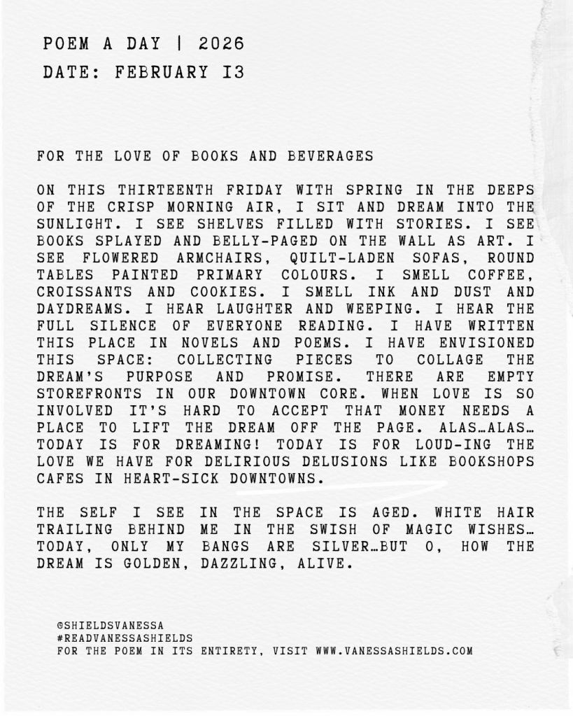 On this thirteenth Friday, with spring in the deeps of the crisp morning air, I sit and dream into the sunlight. I see shelves filled with stories. I see books splayed and belly-paged on the wall as art. I see flowered armchairs, quilt-laden sofas, round tables painted primary colours. I smell coffee, croissants and cookies. I smell ink and dust and daydreams. I hear laughter and weeping. I hear the full silence of everyone reading. I have written this place in novels and poems. I have envisioned this space: collecting pieces to collage the dream’s purpose and promise. There are empty storefronts in our downtown core. When love is so involved it’s hard to accept that money needs a place to lift the dream off the page. Alas…alas…today is for dreaming! Today is for loud-ing the love we have for delirious delusions like bookshops cafes in heart-sick downtowns.
