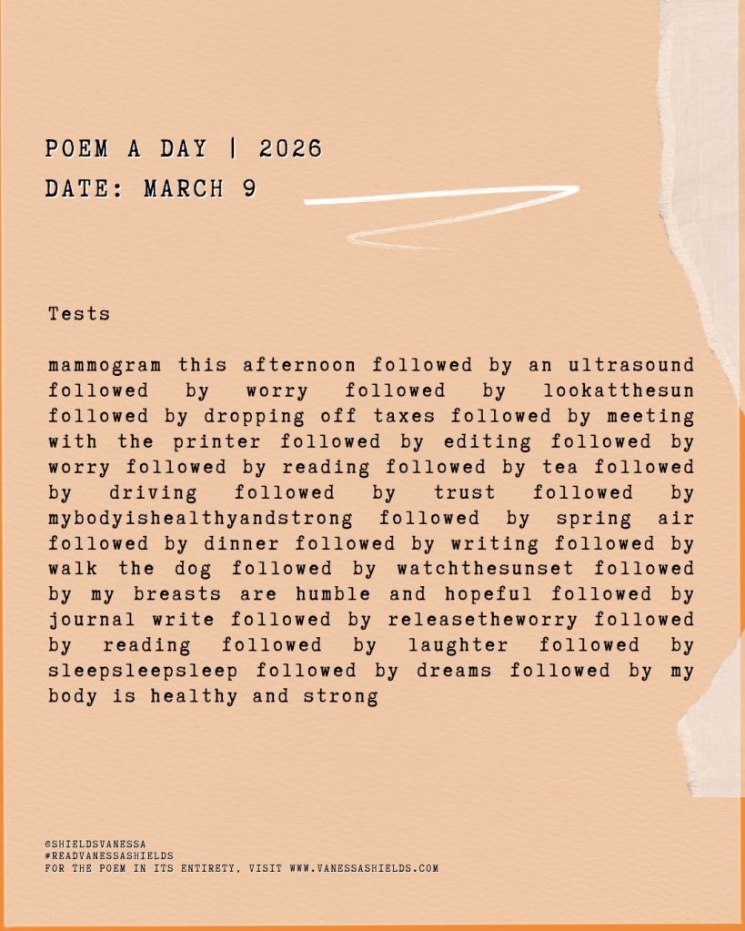 mammogram this afternoon followed by an ultrasound followed by worry followed by lookatthesun followed by dropping off taxes followed by meeting with the printer followed by editing followed by worry followed by reading followed by tea followed by driving followed by trust followed by mybodyishealthyandstrong followed by spring air followed by dinner followed by writing followed by walk the dog followed by watchthesunset followed by my breasts are humble and hopeful followed by journal write followed by releasetheworry followed by reading followed by laughter followed by sleepsleepsleep followed by dreams followed by my body is healthy and strong