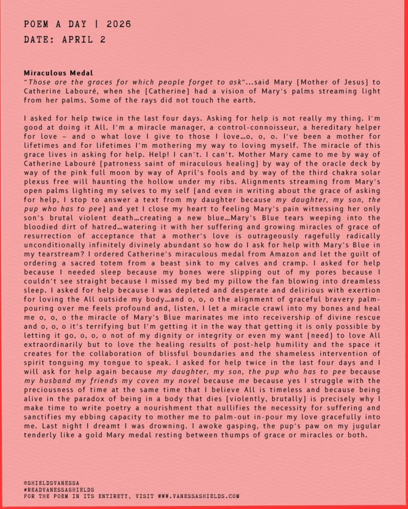 I asked for help twice in the last four days. Asking for help is not really my thing. I’m good at doing it All. I’m a miracle manager, a control-connoisseur, a hereditary helper for love – and o what love I give to those I love…o, o, o. I’ve been a mother for lifetimes and for lifetimes I’m mothering my way to loving myself. The miracle of this grace lives in asking for help. Help! I can’t. I can’t. Mother Mary came to me by way of Catherine Labouré (patroness saint of miraculous healing) by way of the oracle deck by way of the pink full moon by way of April’s fools and by way of the third chakra solar plexus free will haunting the hollow under my ribs. Alignments streaming from Mary’s open palms lighting my selves to my self (and even in writing about the grace of asking for help, I stop to answer a text from my daughter because my daughter, my son, the pup who has to pee) and yet I close my heart to feeling Mary’s pain witnessing her only son’s brutal violent death…creating a new blue…Mary’s Blue tears weeping into the bloodied dirt of hatred…watering it with her suffering and growing miracles of grace of resurrection of acceptance that a mother’s love is outrageously ragefully radically unconditionally infinitely divinely abundant so how do I ask for help with Mary’s Blue in my tearstream? I ordered Catherine’s miraculous medal from Amazon and let the guilt of ordering a sacred totem from a beast sink to my calves and cramp. I asked for help because I needed sleep because my bones were slipping out of my pores because I couldn’t see straight because I missed my bed my pillow the fan blowing into dreamless sleep. I asked for help because I was depleted and desperate and delirious with exertion for loving the All outside my body…and o, o, o the alignment of graceful bravery palm-pouring over me feels profound and, listen, I let a miracle crawl into my bones and heal me o, o, o the miracle of Mary’s Blue marinates me into receivership of divine rescue and o, o, o it’s terrifying but I’m getting it in the way that getting it is only possible by letting it go, o, o, o not of my dignity or integrity or even my want (need) to love All extraordinarily but to love the healing results of post-help humility and the space it creates for the collaboration of blissful boundaries and the shameless intervention of spirit tonguing my tongue to speak. I asked for help twice in the last four days and I will ask for help again because my daughter, my son, the pup who has to pee because my husband my friends my coven my novel because me because yes I struggle with the preciousness of time at the same time that I believe All is timeless and because being alive in the paradox of being in a body that dies (violently, brutally) is precisely why I make time to write poetry a nourishment that nullifies the necessity for suffering and sanctifies my ebbing capacity to mother me to palm-out in-pour my love gracefully into me. Last night I dreamt I was drowning. I awoke gasping, the pup’s paw on my jugular tenderly like a gold Mary medal resting between thumps of grace or miracles or both.