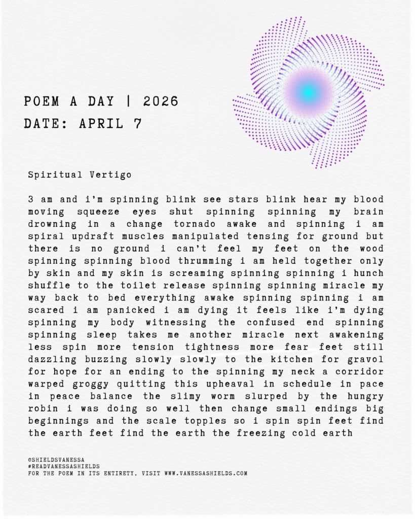 3 am and i’m spinning blink see stars blink hear my blood moving squeeze eyes shut spinning spinning my brain drowning in a change tornado awake and spinning i am spiral updraft muscles manipulated tensing for ground but there is no ground i can’t feel my feet on the wood spinning spinning blood thrumming i am held together only by skin and my skin is screaming spinning spinning i hunch shuffle to the toilet release spinning spinning miracle my way back to bed everything awake spinning spinning i am scared i am panicked i am dying it feels like i’m dying spinning my body witnessing the confused end spinning spinning sleep takes me another miracle next awakening less spin more tension tightness more fear feet still dazzling buzzing slowly slowly to the kitchen for gravol for hope for an ending to the spinning my neck a corridor warped groggy quitting this upheaval in schedule in pace in peace balance the slimy worm slurped by the hungry robin i was doing so well then change small endings big beginnings and the scale topples so i spin spin feet find the earth feet find the earth the freezing cold earth