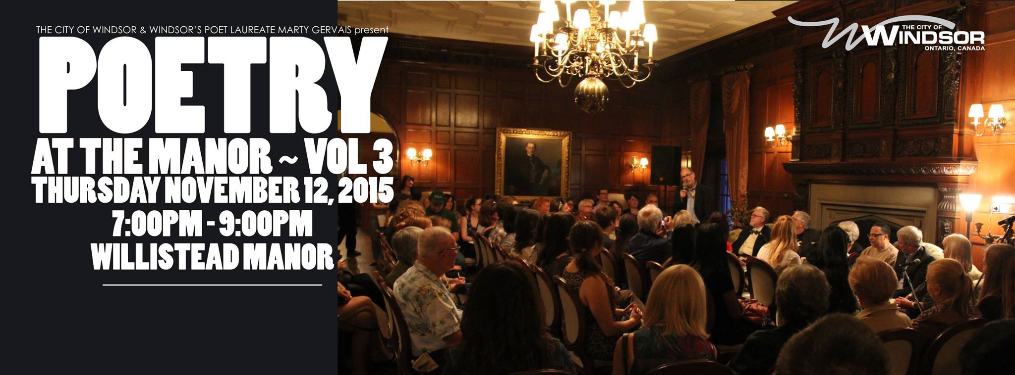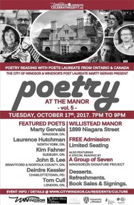 - POSTPONED UNTIL FURTHER NOTICE! Wednesday, October 8, 2014 – 7pm – Poetry At The Manor, Willistead Manor, Windsor, ON w/ Poets Laureates and Other Special Guests