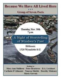 - Wednesday, April 8, 2015, Poetry on Demand, 7pm, Caboto Club of Windsor, Made In Windsor Book Launch, (University of Windsor students)