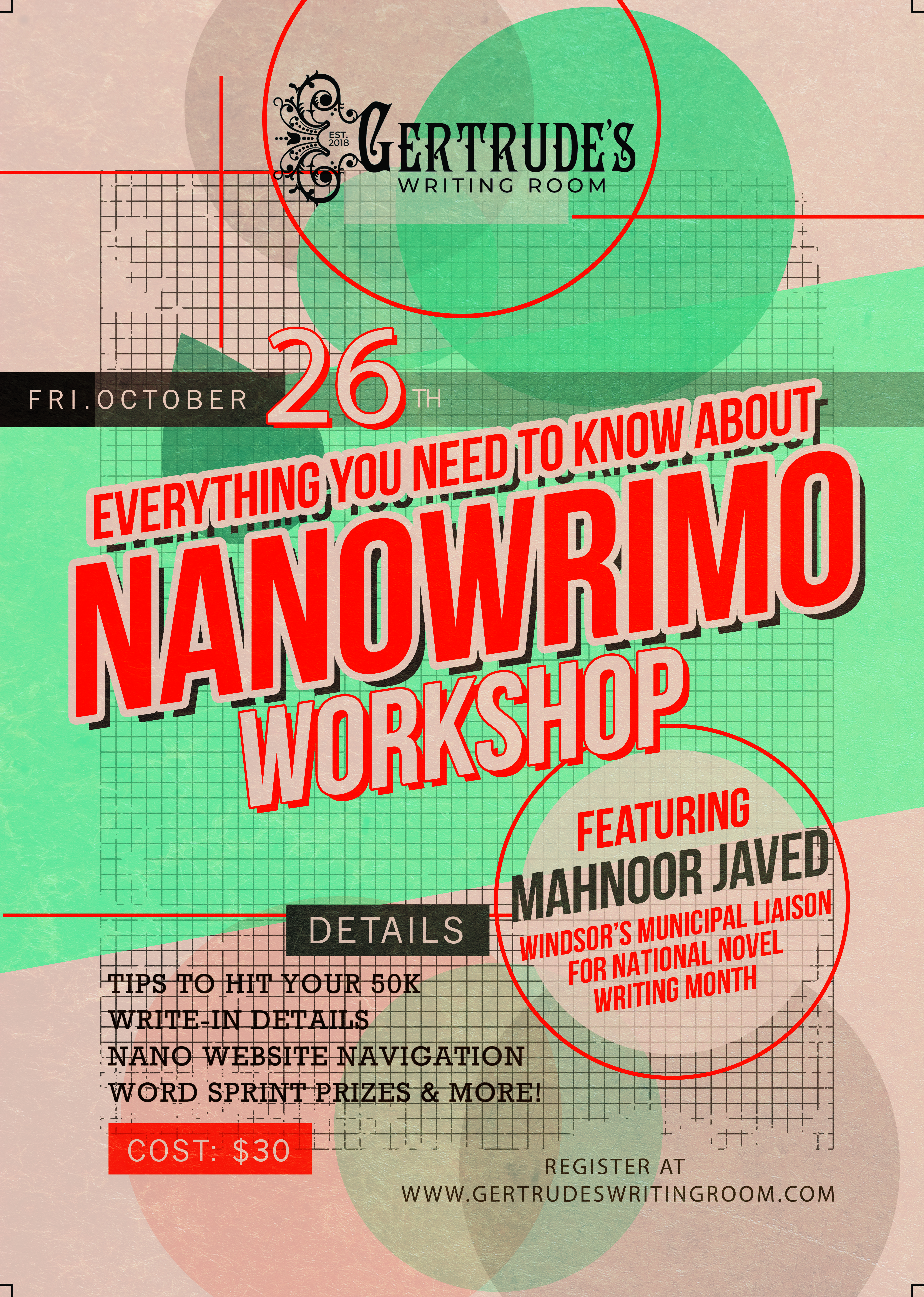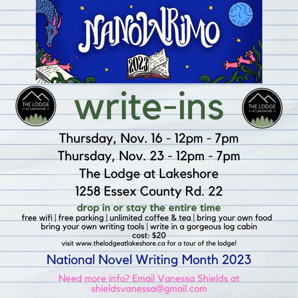 Thursday, November 16 & Thursday, November 23 – 12pm-7pm at the Lodge at Lakeshore a GORGEOUS log cabin perfect for writing! Check out the space HERE!