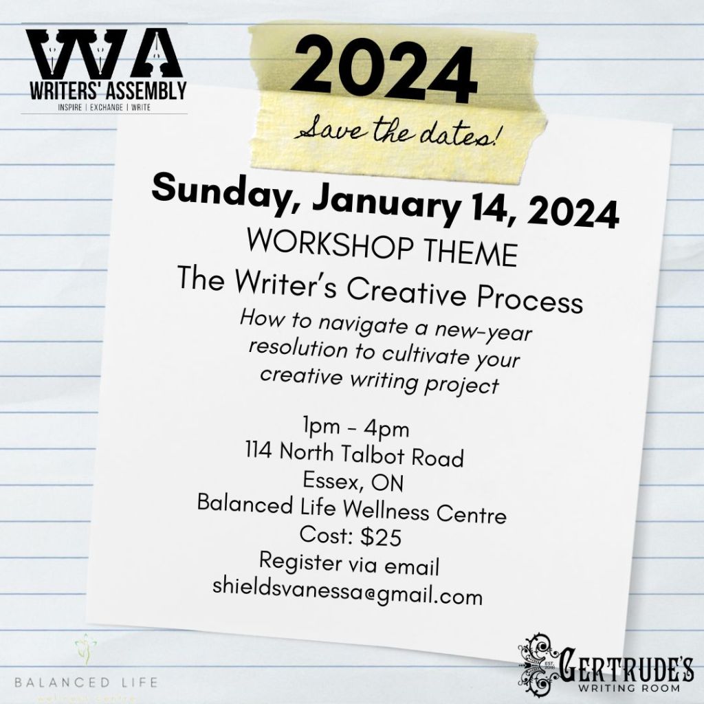 Sunday, January 14, 2024 – Writers’ Assembly – 1pm- 4pm. Balanced Life Wellness Centre, 114 Talbot, Essex