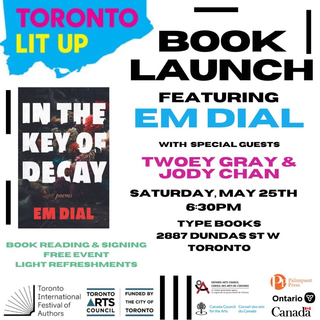 Saturday, May 25, 2024 – Toronto Lit Up Festival, Em Dial Book Launch, Type Books, Toronto, 6:30pm