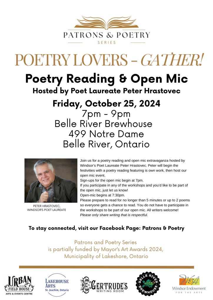 Friday, October 25, 2024 – Patrons & Poetry Series, Poetry Reading & Open Mic, 7pm – 9pm, Belle River Brew House