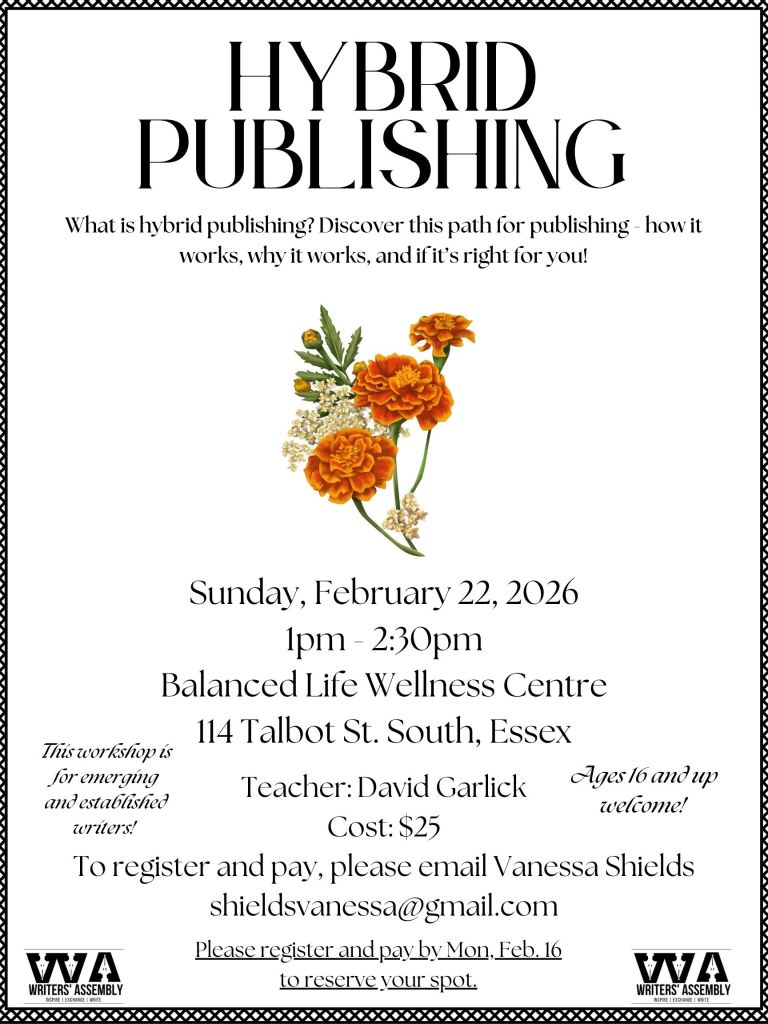 Sunday, February 22, 2026 – Writers’ Assembly, Hybrid Publishing, 1pm – 2:30pm, Teacher: David Garlick, Balanced Life Wellness Centre, 114 Talbot St. S. Essex, Cost: $25 REGISTRATION IS OPEN!