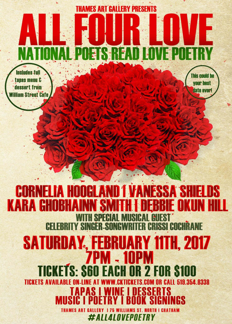 Valentine's Day All 4 Love Poetry Dinner Event! For a mere $55/ticket, you and your LOVE can join 4 poets and a musician as you celebrate Valentine's Day! Join poets Kara Smith, Debbie Okun Hill, Cornelia Hoogland and MOI as we give your our best LOVE poetry! On vocals, serenading us with love songs, Crissi… Continue reading Are you in the mood for LOVE…poetry, music? Come to dinner!