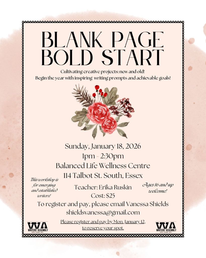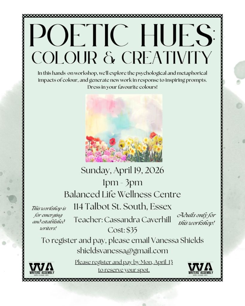 To better accommodate the different styles of teaching and in-workshop participation (some workshops are very hands-on and/or prompt oriented!), please note that there may be changes to both the length of the workshop and the cost. Cost may increase when the length/participation of the workshops shifts. It is important that we remunerate our amazing workshop teachers for their prep-time and supply costs. Please let us know if cost is challenge, we will do our best to accommodate. NEW COSTS AND LENGTHS ARE ON THE POSTERS/MARKETING MATERIALS! PLEASE SEE BELOW! Payment will be made by etransfer to Vanessa Shields. VANESSA’S EMAIL: shieldsvanessa@gmail.com.